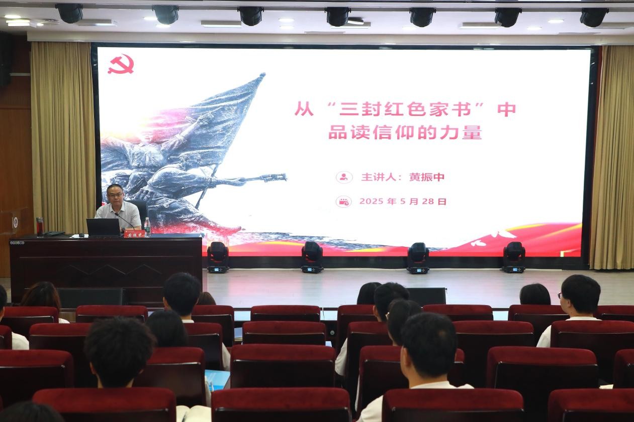 为深入学习贯彻习近平新时代中国特色社会主义思想,进一步激发青年学生的爱国情怀和历史使命感,2025年5月26日,副校长黄振中以“从‘三封红色家书’中品读信仰的力量”为专题,在郑州校区为买球官方网站学生讲授了一堂生动而深刻的思政课。
