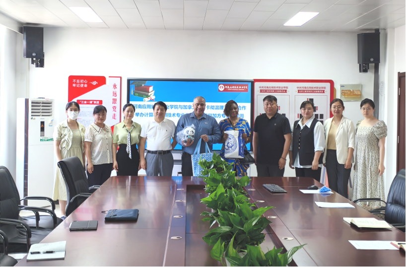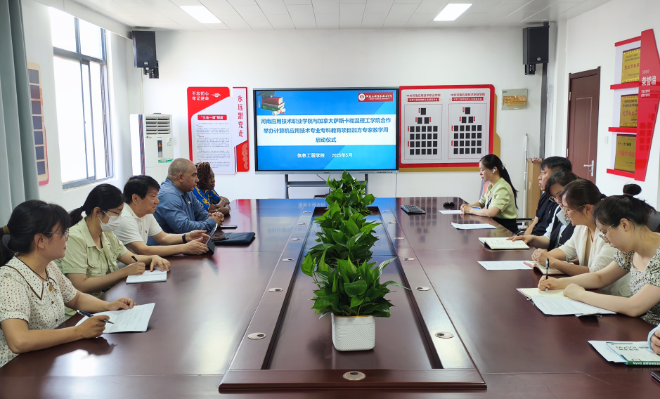 5月19日,河南应用技术职业学院在行政楼512会议室举行了与加拿大萨斯卡彻温理工学院合作计算机应用技术专业专科教育项目加方专家教学周启动仪式。本次会议由副院长夏丽珍主持,参与仪式的有中加国际合作项目主任、项目管理委员会管理专员Bruce Yu,来自加拿大的外教团队Mrs.Ada Ajunwa和Mr.Hazem Youssef老师、科研外事处游渊副处长、买球官方网站党总支书记崔琳、学院院长王雷,语言助教老师李改玲,学院教师代表曲宏阳与学生代表。