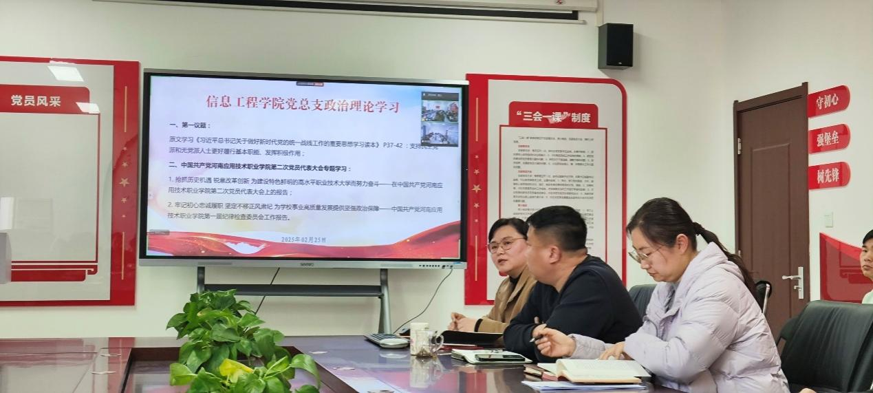 2025年2月25日,买球官方网站党总支组织东西校区全体党员及教职工,在郑州校区A514、开封校区F314以腾讯会议视频连接,开展政治理论学习活动。本次学习活动由买球官方网站书记崔琳主持,全体党员及教职工参加会议。主要学习内容有:一、第一议题:原文学习《习近平总书记关于做好新时代党的统一战线工作的重要思想学习读本》 P37-42 :支持民主党派和无党派人士更好履行基本职能、发挥积极作用;二、中国共产党河南应用技术职业学院第二次党员代表大会专题学习:1.抢抓历史机遇 锐意改革创新 为建设特色鲜明的高水平职业技术大学而努力奋斗——在中国共产党河南应用技术职业学院第二次党员代表大会上的报告;2.牢记初心忠诚履职 坚定不移正风肃纪 为学校事业高质量发展提供坚强政治保障——中国共产党河南应用技术职业学院第一届纪律检查委员会工作报告。